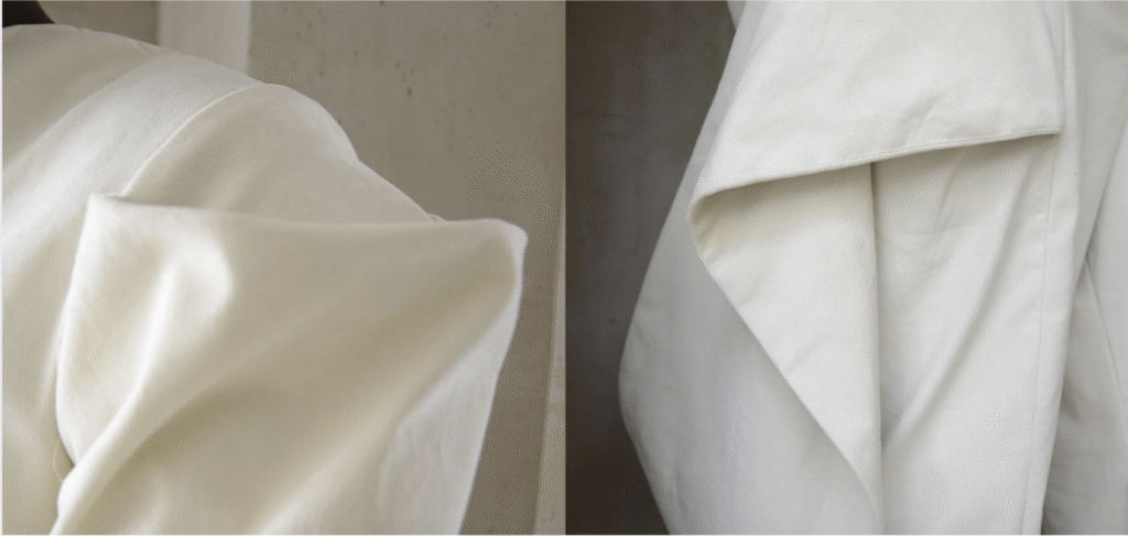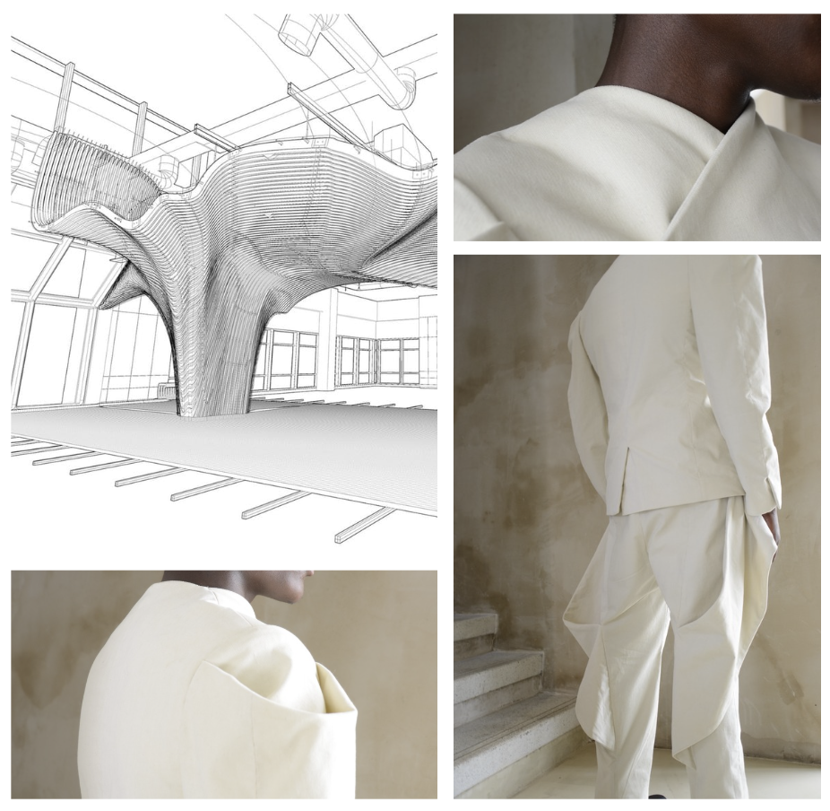 El proceso creativo de esta colección se fundamentó en los principios de la arquitectura orgánica, traduciéndose en muestras textiles que exploran formas circulares con ondas y estructuras definidas. Estas características se incorporaron estratégicamente en los diseños para lograr la estética deseada, enfocada en volúmenes dinámicos y detalles esculturales, como las ondas y los hombros estructurados. Este enfoque permitió desarrollar piezas que equilibran fluidez y solidez, reflejando la armonía natural que inspira la colección.
